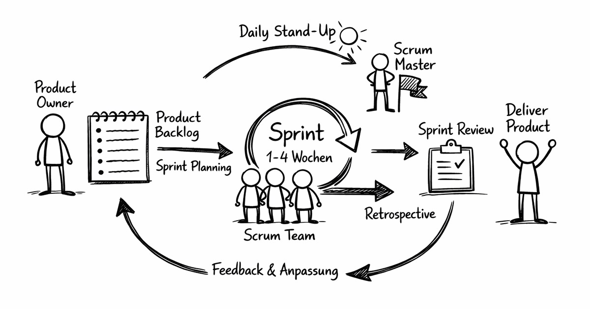 Scrum ist eine Methode aus dem Bereich des agilen Projektmanagements. Agile bedeutet, dass man flexibel und anpassungsfähig arbeitet. Statt lange Pläne zu machen und starr daran festzuhalten, wird bei Scrum in kurzen Abschnitten, sogenannten Sprints, gearbeitet. Ein Sprint dauert meist zwei bis vier Wochen. Am Ende jedes Sprints steht ein fertiges Ergebnis, das überprüft und bei Bedarf angepasst wird.